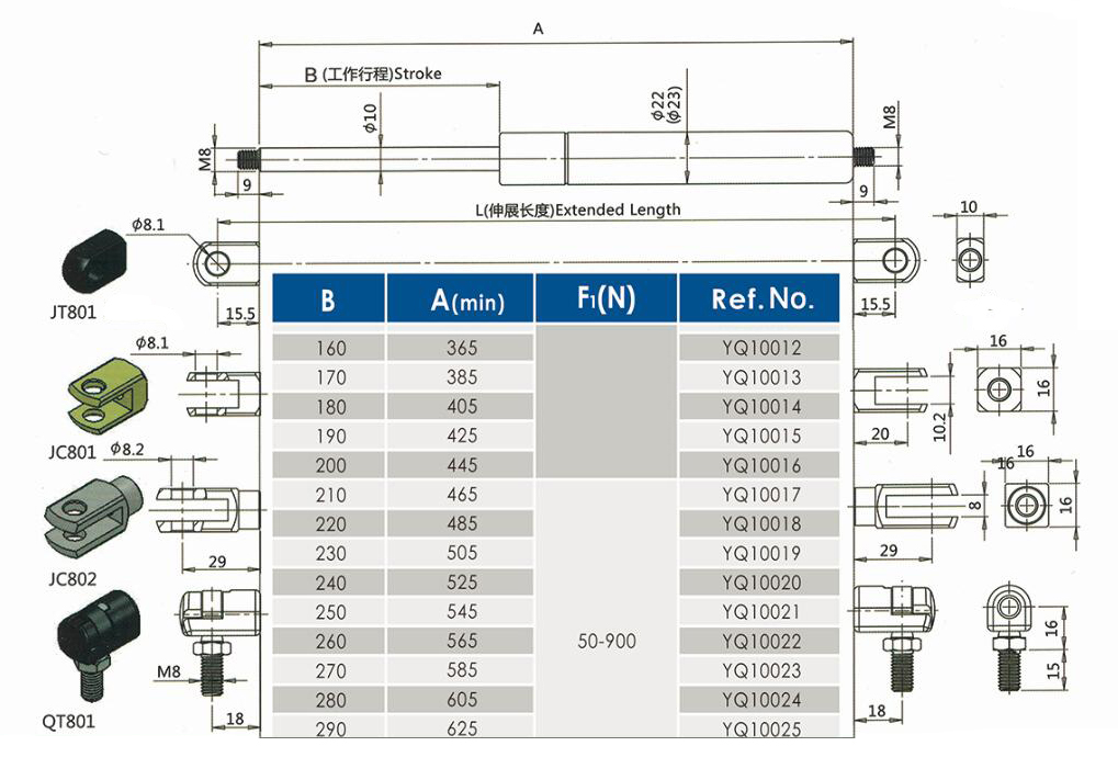 注:由于气弹簧是非标准的,以上仅为型号的一部分。我们可以根据客户的要求定制。