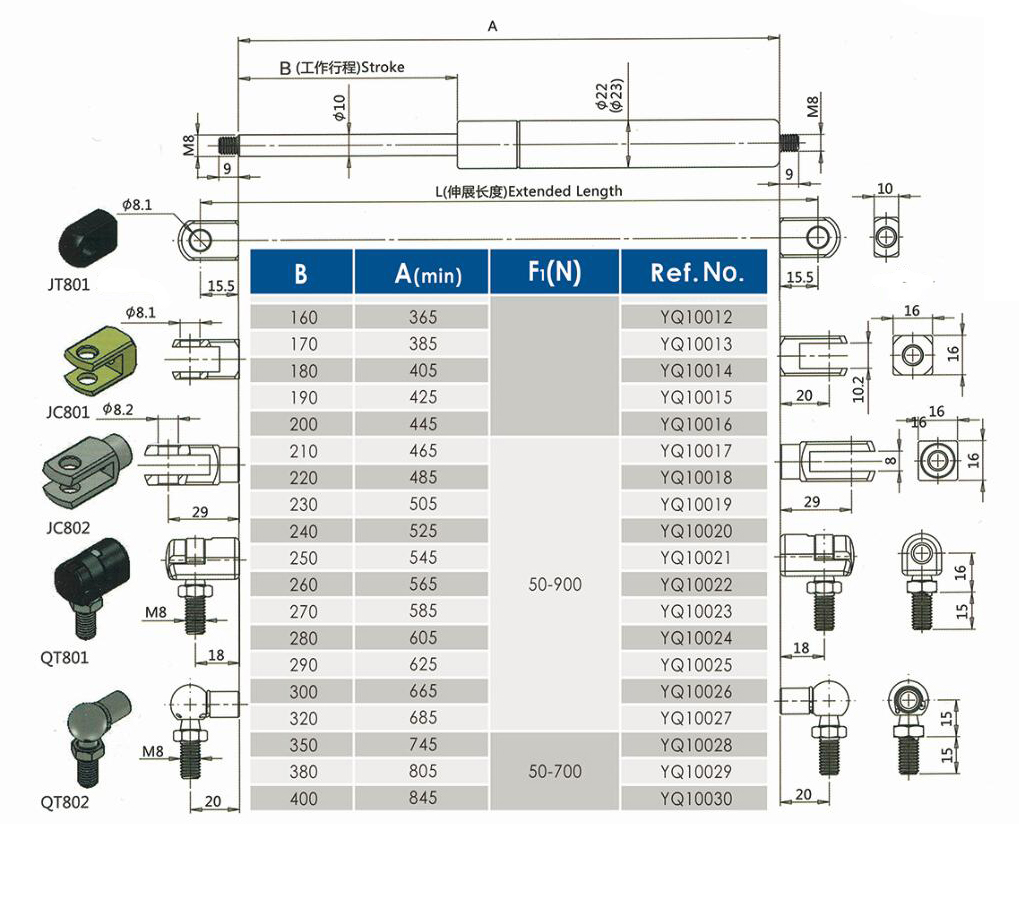 注:由于气弹簧是非标准的,以上仅为型号的一部分。我们可以根据客户的要求定制。