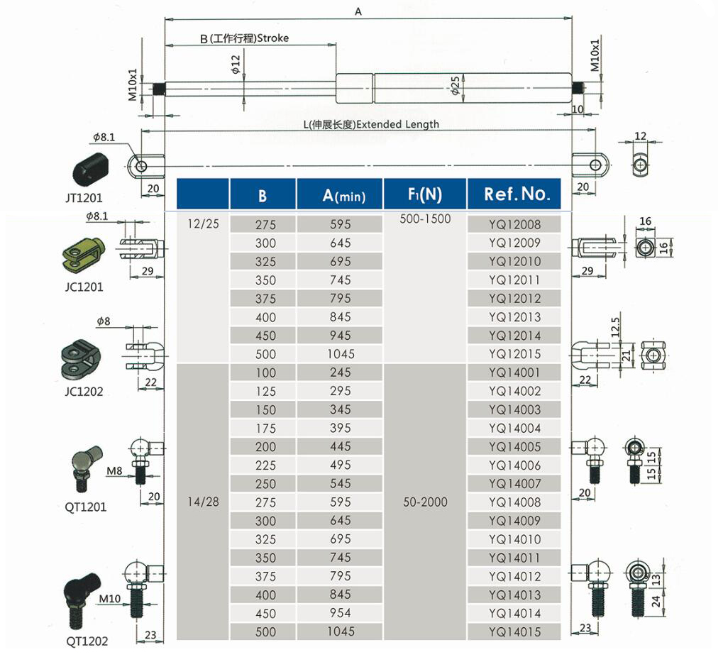 注:由于气弹簧是非标准的,以上仅为型号的一部分。我们可以根据客户的要求定制。
