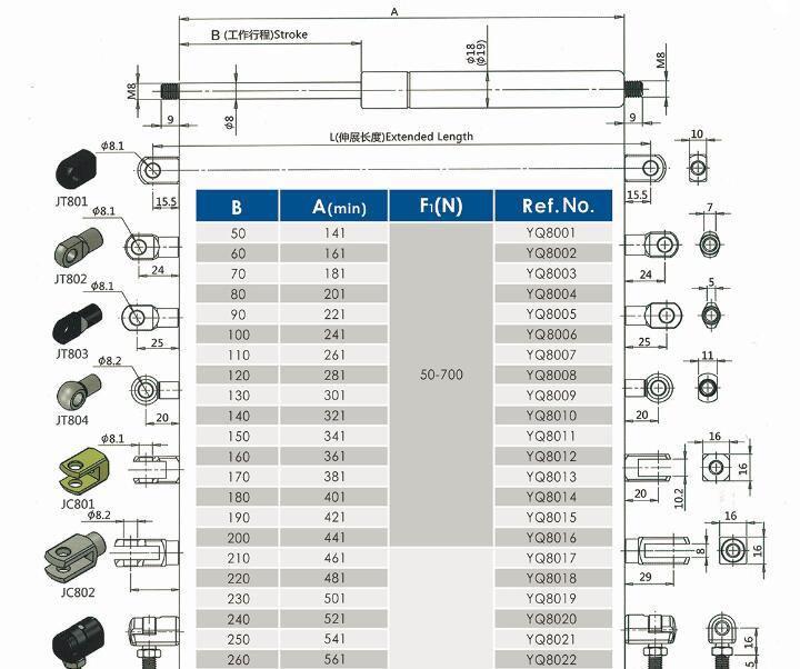 注:由于气弹簧是非标准的,以上仅为型号的一部分。我们可以根据客户的要求定制。